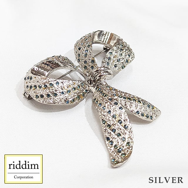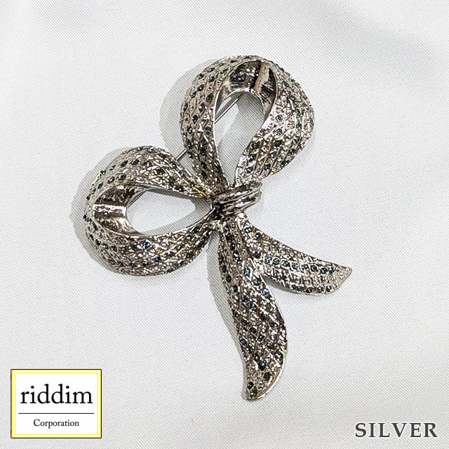 極小のガラスストーンがちりばめられたかわいらしいアンティーク調リボン型ブローチです。