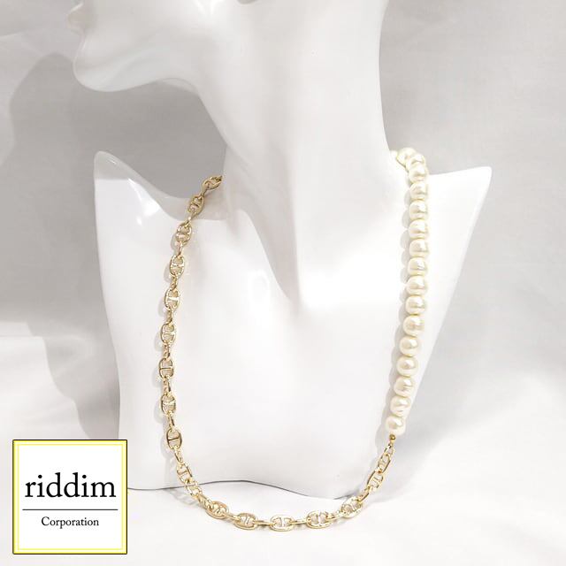 センターバーが入ったオーバルタイプチェーンとガラスパールを組み合わせたアシンメトリーネックレスです。