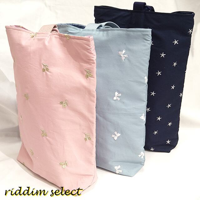 スカイブルーはリボン、ピンクはチェリーの刺繍が入っています。