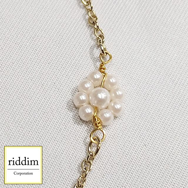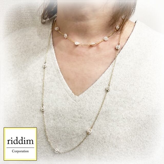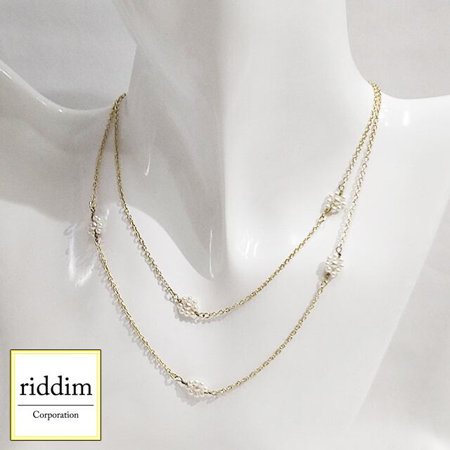 小さなパールフラワーが並んでいるロングネックレス。